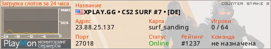 XPLAY.GG • CS2 SURF #7 • [DE] представлен в виде сервера кс 2. Из всех имеющихся на сайте модификаций игровых серверов, наша система поставила метку Surf сервера cs2. В нашем мониторинге игровых серверов вы так же можете найти быструю навигацию по всем меткам - используйте главную страницу игры Counter Strike 2.