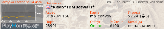 *RRMS*TDMBotWars* представлен в виде сервера код 4. Из всех имеющихся на сайте модификаций игровых серверов, наша система поставила метку Deathmatch сервера cod4. В нашем мониторинге игровых серверов вы так же можете найти быструю навигацию по всем меткам - используйте главную страницу игры Call of Duty 4: Modern Warfare.