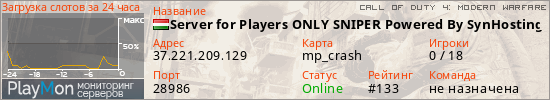 Server for Players ONLY SNIPER Powered By SynHosting.eu | Powered By SynHosting.eu | Powered By SynHosting.eu | Powered By SynHosting.eu | Powered By SynHosting.eu | Powered By SynHosting.eu | Powered By SynHosting.eu | Powered By SynHosting.eu | Powered By SynHosting.eu - Rounds: 5/20 | Powered By SynHosting.eu представлен в виде сервера код 4. Из всех имеющихся на сайте модификаций игровых серверов, вам может понравиться Deathmatch серверы cod4. А для быстрой навигации по всем меткам - используйте главную страницу игры Call of Duty 4: Modern Warfare.