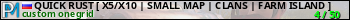 QUICK RUST [ X5/X10 | SMALL MAP | CLANS | FARM ISLAND ] представлен в виде сервера раст. Из всех имеющихся на сайте модификаций игровых серверов, вам может понравиться PvE серверы rust. А для быстрой навигации по всем меткам - используйте главную страницу игры Rust.