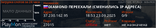 DIAMOND ПЕРЕЕХАЛИ (СМЕНИЛИСЬ IP АДРЕСА) представлен в виде сервера ксс. Из всех имеющихся на сайте модификаций игровых серверов, вам может понравиться DeathRun серверы css. А для быстрой навигации по всем меткам - используйте главную страницу игры Counter Strike Source.
