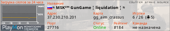 ≈ MSKᶻᵐ GunGame ¦ liquidation ¦ ≈ представлен в виде сервера ксс. Из всех имеющихся на сайте модификаций игровых серверов, наша система поставила метку GunGame сервера css. В нашем мониторинге игровых серверов вы так же можете найти быструю навигацию по всем меткам - используйте главную страницу игры Counter Strike Source.