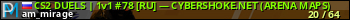 CS2 DUELS | 1v1 #78 [RU] — CYBERSHOKE.NET (ARENA MAPS) представлен в виде сервера кс 2. Из всех имеющихся на сайте модификаций игровых серверов, наша система поставила метку 1vs1 сервера cs2. В нашем мониторинге игровых серверов вы так же можете найти быструю навигацию по всем меткам - используйте главную страницу игры Counter Strike 2.