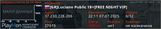 [GR]Luciano Public 18+[FREE NIGHT VIP] представлен в виде сервера кс 1.6. Из всех имеющихся на сайте модификаций игровых серверов, вам может понравиться Knife серверы cs. А для быстрой навигации по всем меткам - используйте главную страницу игры Counter Strike 1.6.