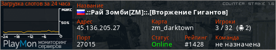 .::Рай Зомби[ZM]::.[Вторжение Гигантов] представлен в виде сервера кс 1.6. Из всех имеющихся на сайте модификаций игровых серверов, наша система поставила метку Zombie сервера cs. В нашем мониторинге игровых серверов вы так же можете найти быструю навигацию по всем меткам - используйте главную страницу игры Counter Strike 1.6.