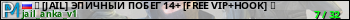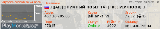 亗 [JAIL] ЭПИЧНЫЙ ПОБЕГ 14+ [FREE VIP+HOOK] 亗 представлен в виде сервера кс 1.6. Из всех имеющихся на сайте модификаций игровых серверов, наша система поставила метку JailBreak сервера cs. В нашем мониторинге игровых серверов вы так же можете найти быструю навигацию по всем меткам - используйте главную страницу игры Counter Strike 1.6.