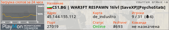 CS1.BG | WAR3FT RESPAWN 16lvl [SaveXP][PsychoStats] представлен в виде сервера кс 1.6. Из всех имеющихся на сайте модификаций игровых серверов, наша система поставила метку War3FT сервера cs. В нашем мониторинге игровых серверов вы так же можете найти быструю навигацию по всем меткам - используйте главную страницу игры Counter Strike 1.6.