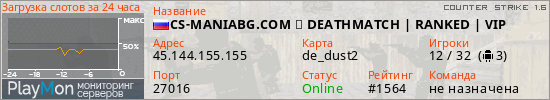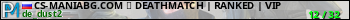 CS-MANIABG.COM ✪ DEATHMATCH | RANKED | VIP представлен в виде сервера кс 1.6. Из всех имеющихся на сайте модификаций игровых серверов, наша система поставила метку DeathMatch сервера cs. В нашем мониторинге игровых серверов вы так же можете найти быструю навигацию по всем меткам - используйте главную страницу игры Counter Strike 1.6.