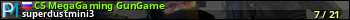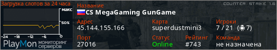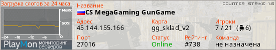 CS MegaGaming GunGame представлен в виде сервера кс 1.6. Из всех имеющихся на сайте модификаций игровых серверов, наша система поставила метку GunGame сервера cs. В нашем мониторинге игровых серверов вы так же можете найти быструю навигацию по всем меткам - используйте главную страницу игры Counter Strike 1.6.