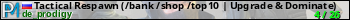Tactical Respawn (/bank /shop /top10 | Upgrade & Dominate) представлен в виде сервера кс 1.6. Из всех имеющихся на сайте модификаций игровых серверов, вам может понравиться DeathMatch серверы cs. А для быстрой навигации по всем меткам - используйте главную страницу игры Counter Strike 1.6.