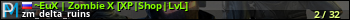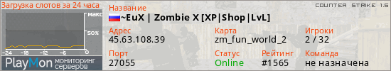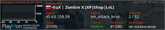 ~EuX | Zombie X [XP|Shop|LvL] представлен в виде сервера кс 1.6. Из всех имеющихся на сайте модификаций игровых серверов, наша система поставила метку Zombie сервера cs. В нашем мониторинге игровых серверов вы так же можете найти быструю навигацию по всем меткам - используйте главную страницу игры Counter Strike 1.6.