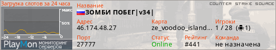 ЗОМБИ ПОБЕГ|v34| представлен в виде сервера ксс. Из всех имеющихся на сайте модификаций игровых серверов, наша система поставила метку Zombie сервера css. В нашем мониторинге игровых серверов вы так же можете найти быструю навигацию по всем меткам - используйте главную страницу игры Counter Strike Source.