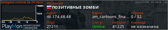 ПОЗИТИВНЫЕ ЗОМБИ представлен в виде сервера кс 1.6. Из всех имеющихся на сайте модификаций игровых серверов, наша система поставила метку Zombie сервера cs. В нашем мониторинге игровых серверов вы так же можете найти быструю навигацию по всем меткам - используйте главную страницу игры Counter Strike 1.6.