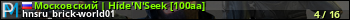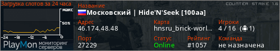 Московский | Hide'N'Seek [100aa] представлен в виде сервера кс 1.6. Из всех имеющихся на сайте модификаций игровых серверов, наша система поставила метку Hide'n'Seek сервера cs. В нашем мониторинге игровых серверов вы так же можете найти быструю навигацию по всем меткам - используйте главную страницу игры Counter Strike 1.6.