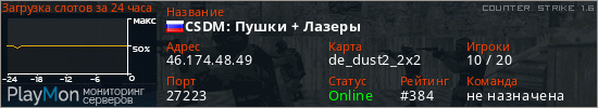 CSDM: Пушки + Лазеры представлен в виде сервера кс 1.6. Из всех имеющихся на сайте модификаций игровых серверов, наша система поставила метку Пушки + Лазеры сервера cs. В нашем мониторинге игровых серверов вы так же можете найти быструю навигацию по всем меткам - используйте главную страницу игры Counter Strike 1.6.