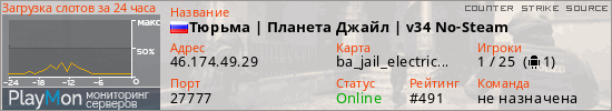 Тюрьма | Планета Джайл | v34 No-Steam представлен в виде сервера ксс. Из всех имеющихся на сайте модификаций игровых серверов, наша система поставила метку JailBreak сервера css. В нашем мониторинге игровых серверов вы так же можете найти быструю навигацию по всем меткам - используйте главную страницу игры Counter Strike Source.