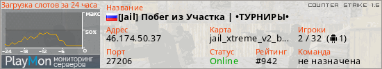 [Jail] Побег из Участка | •ТУРНИРЫ• представлен в виде сервера кс 1.6. Из всех имеющихся на сайте модификаций игровых серверов, наша система поставила метку JailBreak сервера cs. В нашем мониторинге игровых серверов вы так же можете найти быструю навигацию по всем меткам - используйте главную страницу игры Counter Strike 1.6.