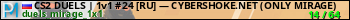 CS2 DUELS | 1v1 #24 [RU] — CYBERSHOKE.NET (ONLY MIRAGE) представлен в виде сервера кс 2. Из всех имеющихся на сайте модификаций игровых серверов, наша система поставила метку 1vs1 сервера cs2. В нашем мониторинге игровых серверов вы так же можете найти быструю навигацию по всем меткам - используйте главную страницу игры Counter Strike 2.