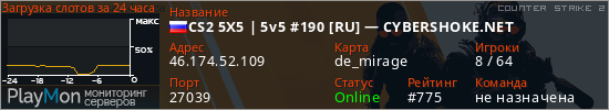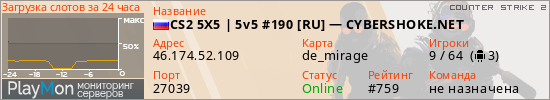 CS2 5X5 | 5v5 #190 [RU] — CYBERSHOKE.NET представлен в виде сервера кс 2. Из всех имеющихся на сайте модификаций игровых серверов, наша система поставила метку 5vs5 сервера cs2. В нашем мониторинге игровых серверов вы так же можете найти быструю навигацию по всем меткам - используйте главную страницу игры Counter Strike 2.