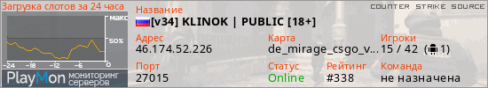 [v34] KLINOK | PUBLIC [18+] представлен в виде сервера ксс. Из всех имеющихся на сайте модификаций игровых серверов, вам может понравиться Surf серверы css. А для быстрой навигации по всем меткам - используйте главную страницу игры Counter Strike Source.