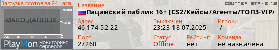 Пацанский пaблик 16+ [CS2/Кейсы/Агенты/ТОП3-VIP/Тест-VIP] представлен в виде сервера кс 1.6. Из всех имеющихся на сайте модификаций игровых серверов, вам может понравиться Surf серверы cs. А для быстрой навигации по всем меткам - используйте главную страницу игры Counter Strike 1.6.