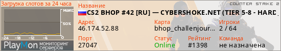 CS2 BHOP #42 [RU] — CYBERSHOKE.NET (TIER 5-8 - HARD) представлен в виде сервера кс 2. Из всех имеющихся на сайте модификаций игровых серверов, вам может понравиться GunGame серверы cs2. А для быстрой навигации по всем меткам - используйте главную страницу игры Counter Strike 2.