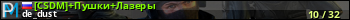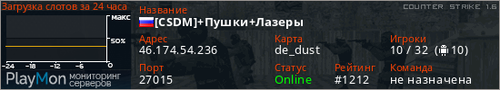 [CSDM]+Пушки+Лазеры представлен в виде сервера кс 1.6. Из всех имеющихся на сайте модификаций игровых серверов, наша система поставила метку Пушки + Лазеры сервера cs. В нашем мониторинге игровых серверов вы так же можете найти быструю навигацию по всем меткам - используйте главную страницу игры Counter Strike 1.6.
