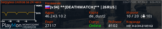 [v34] **[DEATHMATCH]** |26RUS| представлен в виде сервера ксс. Из всех имеющихся на сайте модификаций игровых серверов, наша система поставила метку DeathMatch сервера css. В нашем мониторинге игровых серверов вы так же можете найти быструю навигацию по всем меткам - используйте главную страницу игры Counter Strike Source.