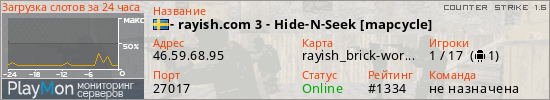 - rayish.com 3 - Hide-N-Seek [mapcycle] представлен в виде сервера кс 1.6. Из всех имеющихся на сайте модификаций игровых серверов, наша система поставила метку Hide'n'Seek сервера cs. В нашем мониторинге игровых серверов вы так же можете найти быструю навигацию по всем меткам - используйте главную страницу игры Counter Strike 1.6.
