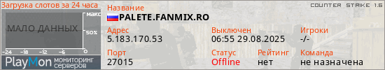 PALETE.FANMIX.RO представлен в виде сервера кс 1.6. Из всех имеющихся на сайте модификаций игровых серверов, вам может понравиться Hide'n'Seek серверы cs. А для быстрой навигации по всем меткам - используйте главную страницу игры Counter Strike 1.6.