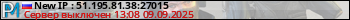 New IP : 51.195.81.38:27015 представлен в виде сервера кс 1.6. Из всех имеющихся на сайте модификаций игровых серверов, вам может понравиться DeathMatch серверы cs. А для быстрой навигации по всем меткам - используйте главную страницу игры Counter Strike 1.6.