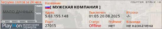 [ МУЖСКАЯ КОМПАНИЯ ] представлен в виде сервера кс 1.6. Из всех имеющихся на сайте модификаций игровых серверов, вам может понравиться Knife серверы cs. А для быстрой навигации по всем меткам - используйте главную страницу игры Counter Strike 1.6.