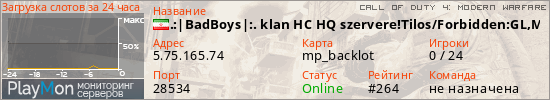 .:|BadBoys|:. klan HC HQ szervere!Tilos/Forbidden:GL,MD,LS,Jugger,3FRAG,RPG csak helire!Rules:Facebook: BBCLANHQ luxhosting.hu представлен в виде сервера код 4. Из всех имеющихся на сайте модификаций игровых серверов, вам может понравиться HardCore серверы cod4. А для быстрой навигации по всем меткам - используйте главную страницу игры Call of Duty 4: Modern Warfare.