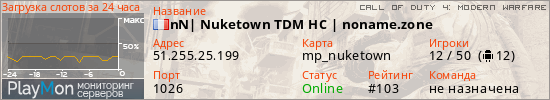 nN| Nuketown TDM HC | noname.zone представлен в виде сервера код 4. Из всех имеющихся на сайте модификаций игровых серверов, наша система поставила метку Deathmatch сервера cod4. В нашем мониторинге игровых серверов вы так же можете найти быструю навигацию по всем меткам - используйте главную страницу игры Call of Duty 4: Modern Warfare.