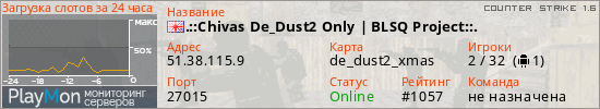 .::Chivas De_Dust2 Only | BLSQ Project::. представлен в виде сервера кс 1.6. Из всех имеющихся на сайте модификаций игровых серверов, вам может понравиться Hide'n'Seek серверы cs. А для быстрой навигации по всем меткам - используйте главную страницу игры Counter Strike 1.6.