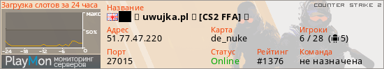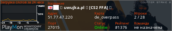 ██ ★ uwujka.pl ★ [CS2 FFA] ⚫ представлен в виде сервера кс 2. Из всех имеющихся на сайте модификаций игровых серверов, наша система поставила метку FFA сервера cs2. В нашем мониторинге игровых серверов вы так же можете найти быструю навигацию по всем меткам - используйте главную страницу игры Counter Strike 2.