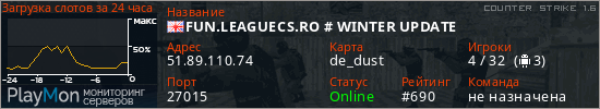 FUN.LEAGUECS.RO # WINTER UPDATE представлен в виде сервера кс 1.6. Из всех имеющихся на сайте модификаций игровых серверов, наша система поставила метку Classic сервера cs. В нашем мониторинге игровых серверов вы так же можете найти быструю навигацию по всем меткам - используйте главную страницу игры Counter Strike 1.6.