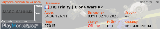 Общая информация ID: 5744 Ссылка: https://playmon.ru/server/54.36.126.11:27015 Адрес: 54.36.126.11:27015 Игроки: 0/60 Статус: Выключен Владелец: Не определён