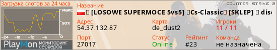 ★ [LOSOWE SUPERMOCE 5vs5] ★Cs-Classic★ [SKLEP] ★ discor представлен в виде сервера кс 2. Из всех имеющихся на сайте модификаций игровых серверов, наша система поставила метку Classic сервера cs2. В нашем мониторинге игровых серверов вы так же можете найти где поиграть на 5vs5 сервере кс 2.