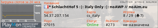 * SchlachtHof 5 :|: Italy Only :|: noAWP // noAim.eu представлен в виде сервера ксс. Из всех имеющихся на сайте модификаций игровых серверов, наша система поставила метку AWP сервера css. В нашем мониторинге игровых серверов вы так же можете найти быструю навигацию по всем меткам - используйте главную страницу игры Counter Strike Source.