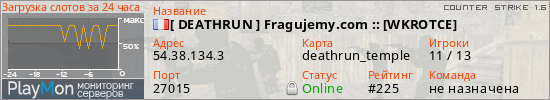 [ DEATHRUN ] Fragujemy.com :: [WKROTCE] представлен в виде сервера кс 1.6. Из всех имеющихся на сайте модификаций игровых серверов, наша система поставила метку DeathRun сервера cs. В нашем мониторинге игровых серверов вы так же можете найти быструю навигацию по всем меткам - используйте главную страницу игры Counter Strike 1.6.