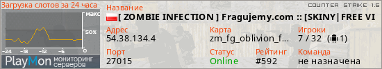 [ ZOMBIE INFECTION ] Fragujemy.com :: [SKINY|FREE VIP 22-10|PREMIUM] представлен в виде сервера кс 1.6. Из всех имеющихся на сайте модификаций игровых серверов, наша система поставила метку Zombie сервера cs. В нашем мониторинге игровых серверов вы так же можете найти быструю навигацию по всем меткам - используйте главную страницу игры Counter Strike 1.6.