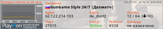 GunGame Style 24/7 |Дезматч| представлен в виде сервера ксс. Из всех имеющихся на сайте модификаций игровых серверов, наша система поставила метку GunGame сервера css. В нашем мониторинге игровых серверов вы так же можете найти быструю навигацию по всем меткам - используйте главную страницу игры Counter Strike Source.