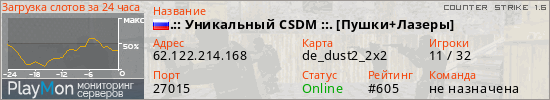 .:: Уникальный CSDM ::. [Пушки+Лазеры] представлен в виде сервера кс 1.6. Из всех имеющихся на сайте модификаций игровых серверов, наша система поставила метку Пушки + Лазеры сервера cs. В нашем мониторинге игровых серверов вы так же можете найти быструю навигацию по всем меткам - используйте главную страницу игры Counter Strike 1.6.