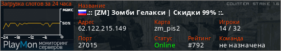.:: [ZM] Зомби Гелакси | Скидки 99% ::. представлен в виде сервера кс 1.6. Из всех имеющихся на сайте модификаций игровых серверов, наша система поставила метку Zombie сервера cs. В нашем мониторинге игровых серверов вы так же можете найти быструю навигацию по всем меткам - используйте главную страницу игры Counter Strike 1.6.