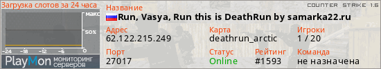 Run, Vasya, Run this is DeathRun by samarka22.ru представлен в виде сервера кс 1.6. Из всех имеющихся на сайте модификаций игровых серверов, наша система поставила метку DeathRun сервера cs. В нашем мониторинге игровых серверов вы так же можете найти быструю навигацию по всем меткам - используйте главную страницу игры Counter Strike 1.6.