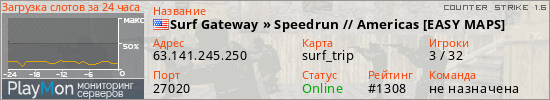 Surf Gateway » Speedrun // Americas [EASY MAPS] представлен в виде сервера кс 1.6. Из всех имеющихся на сайте модификаций игровых серверов, наша система поставила метку Surf сервера cs. В нашем мониторинге игровых серверов вы так же можете найти быструю навигацию по всем меткам - используйте главную страницу игры Counter Strike 1.6.