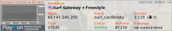 Surf Gateway » Freestyle представлен в виде сервера кс 1.6. Из всех имеющихся на сайте модификаций игровых серверов, наша система поставила метку Surf сервера cs. В нашем мониторинге игровых серверов вы так же можете найти быструю навигацию по всем меткам - используйте главную страницу игры Counter Strike 1.6.