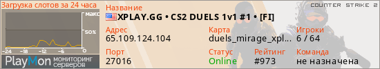 XPLAY.GG • CS2 DUELS 1v1 #1 • [FI] представлен в виде сервера кс 2. Из всех имеющихся на сайте модификаций игровых серверов, наша система поставила метку 1vs1 сервера cs2. В нашем мониторинге игровых серверов вы так же можете найти быструю навигацию по всем меткам - используйте главную страницу игры Counter Strike 2.