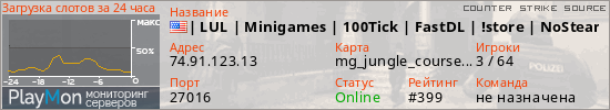 | LUL | Minigames | 100Tick | FastDL | !store | NoSteam представлен в виде сервера ксс. Из всех имеющихся на сайте модификаций игровых серверов, наша система поставила метку MiniGame сервера css. В нашем мониторинге игровых серверов вы так же можете найти быструю навигацию по всем меткам - используйте главную страницу игры Counter Strike Source.